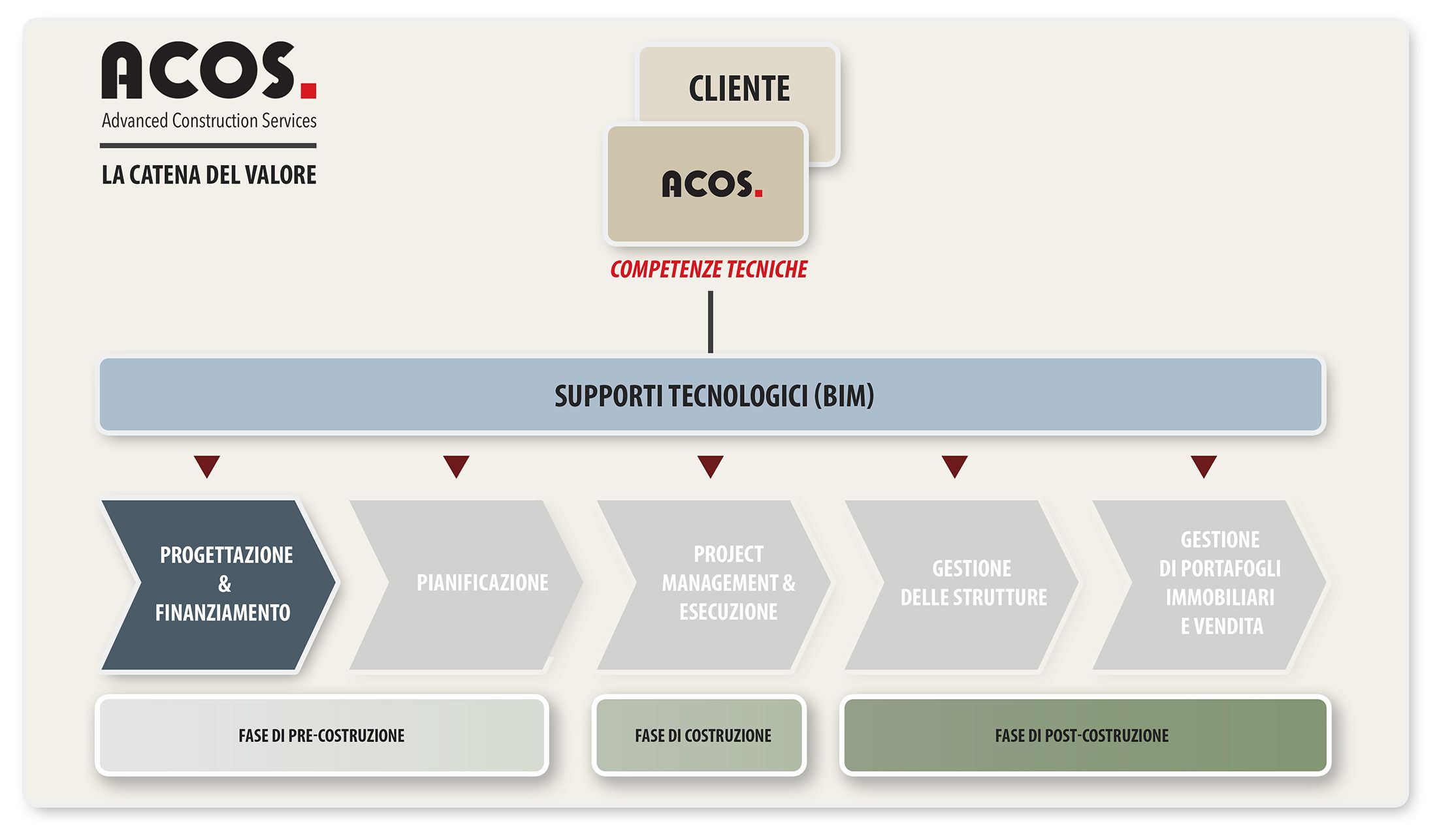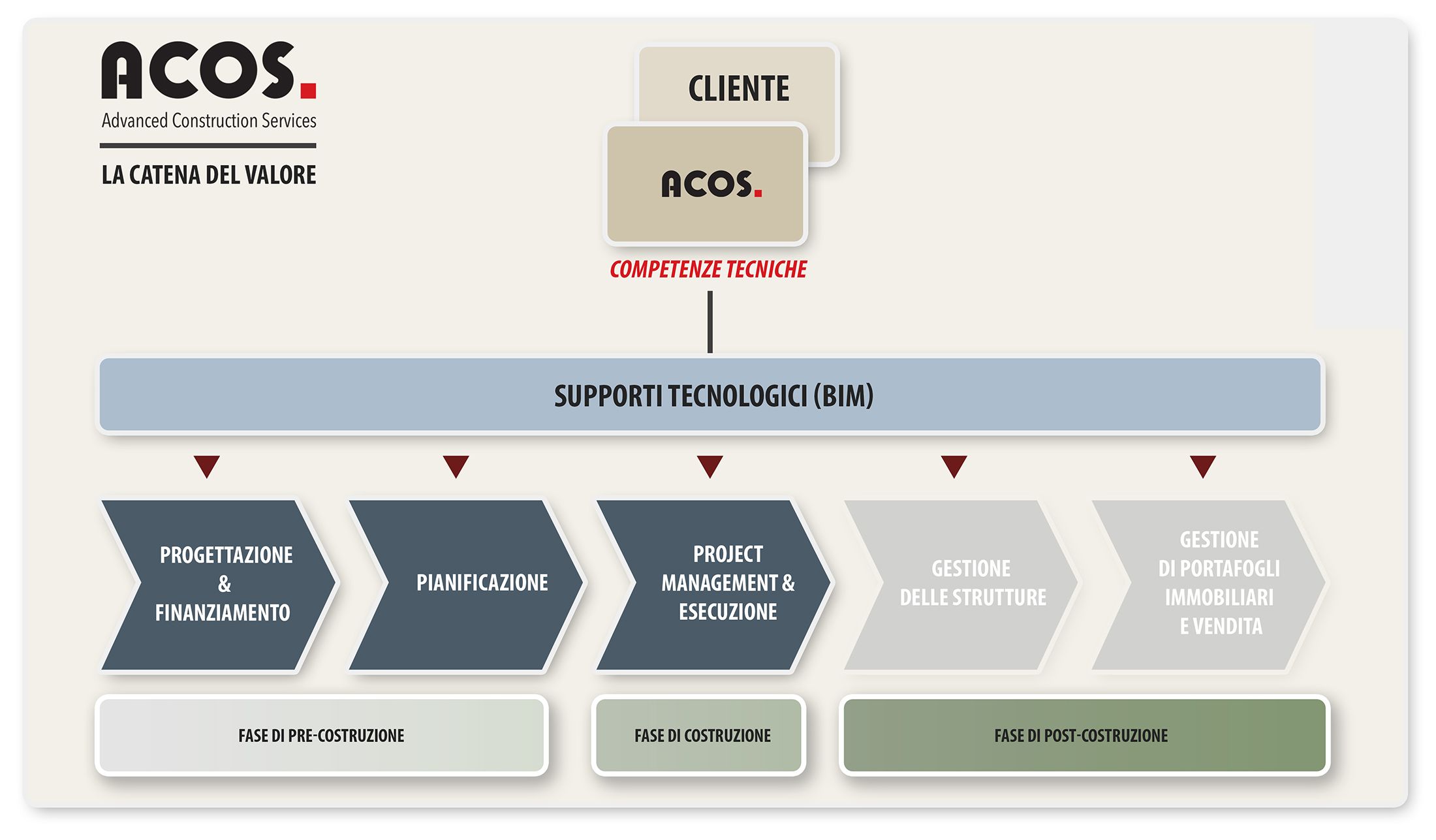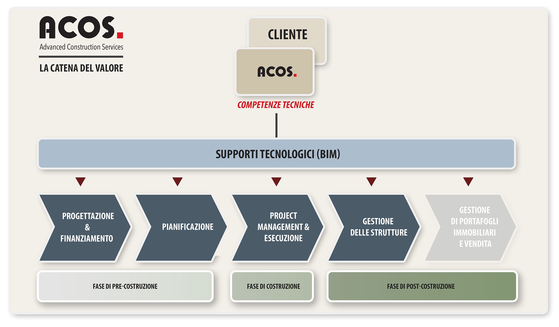 Nella fase di post-costruzione, ACOS può intervenire come gestore della struttura, occupandosi del mantenimento degli edifici e dei loro impianti e servizi (elettricità, gas, impianti idraulici, illuminazione, pulizia, ristorazione, portineria, etc).